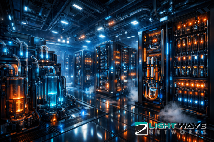 Data center evolution timeline showing 1960s mainframe room, modern server racks, high-density GPU cabinet, and glowing NEXT server representing future AI infrastructure, with the Lightwave Networks logo in the bottom right corner.